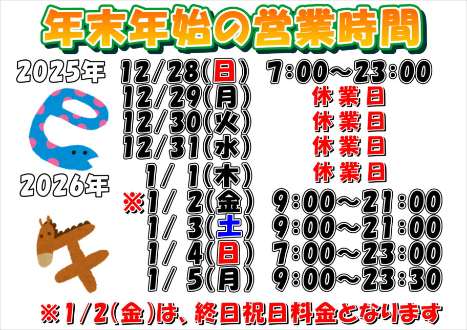 年末年始の営業日、営業時間のご案内です! 《 2 0 2 5 年 》 12/28( 日 ) 7:00~23:00 12/29( 月 ) 休 業 日 12/30( 火 ) 休 業 日 12/31( 水 ) 休 業 日 《 2 0 2 6 年 》 1/ 1( 木 ) 休 業 日 1/ 2( 金 ) 9:00~21:00 1/ 3( 土 ) 9:00~21:00 1/ 4( 日 ) 7:00〜23:00 1/ 5( 月 ) 9:00〜23:30 ※1/2(木)は終日祝日料金となります